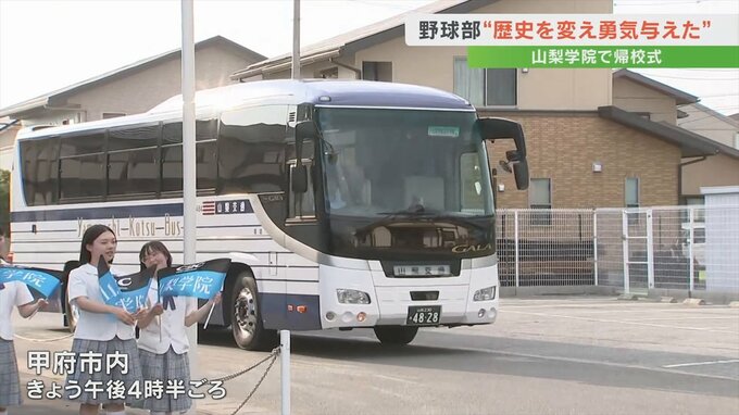山梨学院の野球部員は午後4時半ごろ甲府市の砂田球場に戻り、生徒会や教員、保護者らが温かい拍手で迎えました。