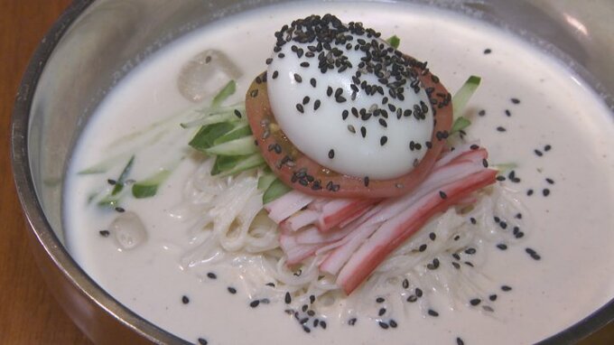 それが、「コングクス」です。韓国の夏の定番メニューで黒豆や大豆、ピーナッツなどをゆでてミキサーにかけ自家製の豆乳スープにそうめんをつけていただきます。