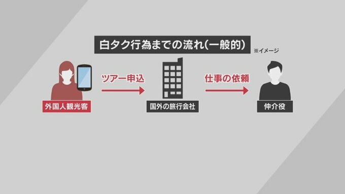 一般的な白タク行為は来日前に外国人観光客が海外の旅行会社にツアーを申し込み、その会社が仲介役に車やドライバーの確保を依頼。