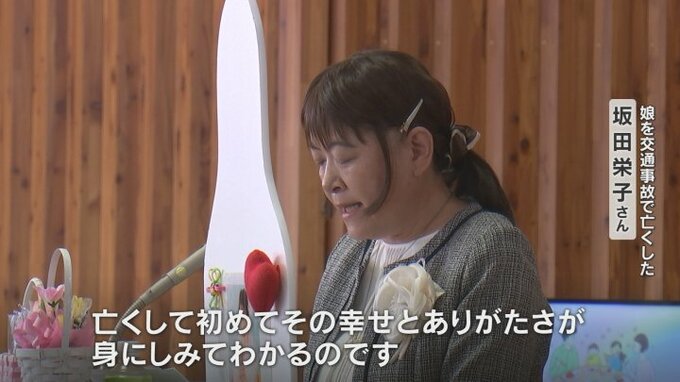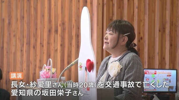 警察などが毎年開いているもので、11月28日は、長女で20歳だった紗愛里さんを交通事故で亡くした愛知県の坂田栄子さんが講演しました。