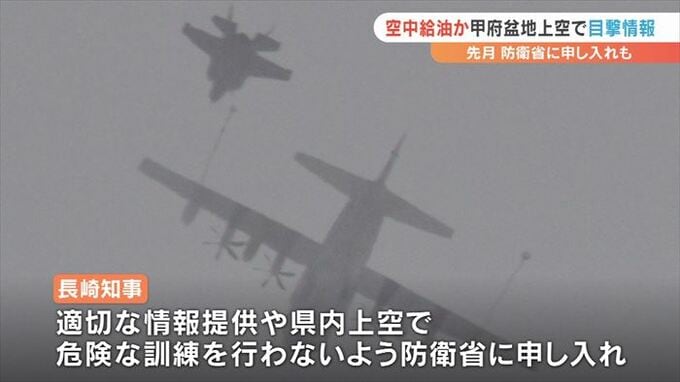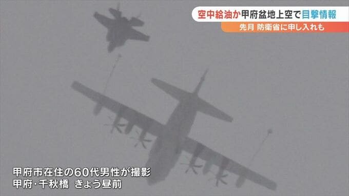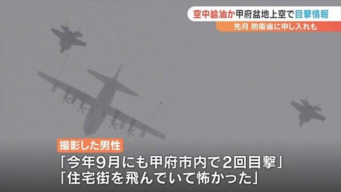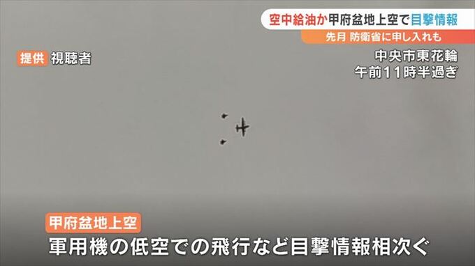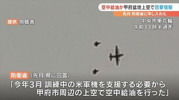 甲府盆地上空では今年、軍用機の低空での飛行などの目撃情報が相次いでいて、10月に県は防衛省から「今年3月、訓練中の米軍機を支援する必要から甲府市周辺の上空で空中給油を行った」と回答があったとしています。