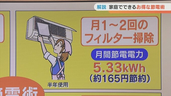 そしてエアコンのフィルターの掃除。月に一、二回掃除すると5.33kWh、大体165円くらいの節約になってきます。