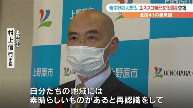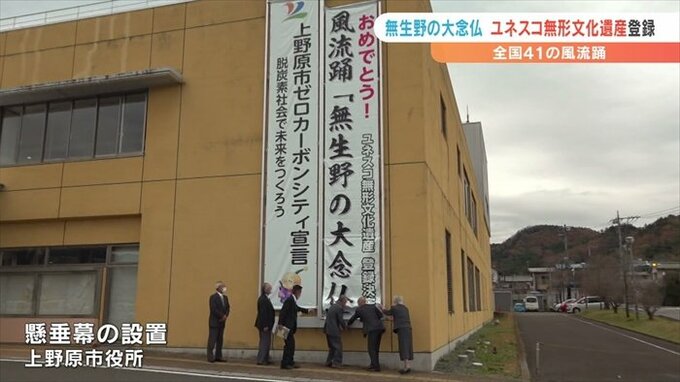 山梨県上野原市秋山に伝わる踊り「無生野の大念仏」がユネスコの無形文化遺産に登録され、市役所には懸垂幕が掲げられました。