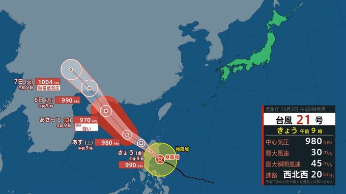 気象庁によりますと台風21号は今後、強い勢力に発達する見込みです。