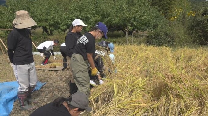 年間を通して本格的な農業を体験しようと、山梨市の小学生が 田植えした稲の刈り取りを行いました。