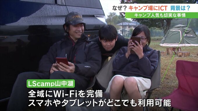 キャンプ場全域にはWi-Fiを完備。スマートフォンやタブレットがどこでも利用できます。そのためわざわざ受付に行かなくても専用のアプリでチェックインができ、混雑を避けられるとともにスタッフも最小限の人数で運営できます。