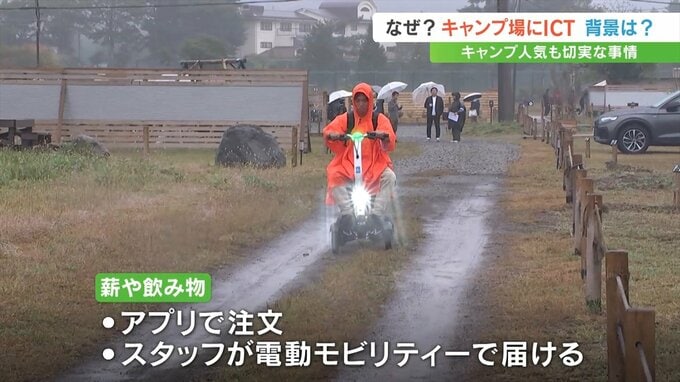 キャンプ場で販売している薪や飲み物などをアプリで注文し、スタッフが電動モビリティーで届けるデリバリーサービスもあります。