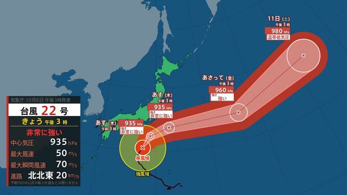 非常に強い台風22号は、8日15時には青ヶ島の南西約300キロにあって、1時間におよそ20キロの速さで北北東へ進んでいます。