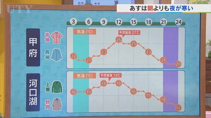 一方、河口湖は予想最高気温が19℃、きょうと比べて7℃も低くなります。