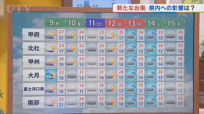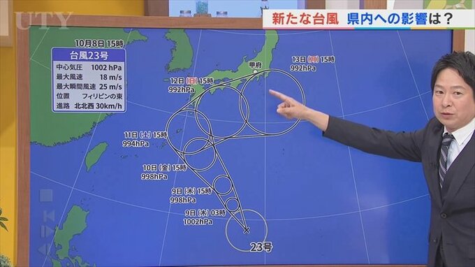 今のところ13日月曜日が山梨に最も接近する予想となっています。この黒い円を予報円といいますが、この円の間隔が広ければ広いほど精度がまだそこまで高くないということです。ですから、まだちょっと何とも言えない状況ですが最新の予報をこまめに確認するようにしてください。
