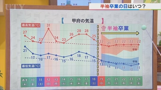 甲府の16日間先の予報を見ていきますと、来週また25℃以上の夏日の日が連発する予想となっています。この25℃以上というのが、半袖を着られる目安となります。