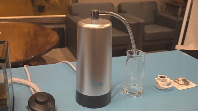 浄水器はシノン電器産業のグループ企業が製造したもので、蛇口への取り付けに加え、足踏みポンプで雨水などをくみ上げて飲み水にできるということです。