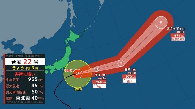 非常に強い台風第22号は、伊豆諸島から遠ざかり、9日は日本の東を東北東へ進む見込みです。