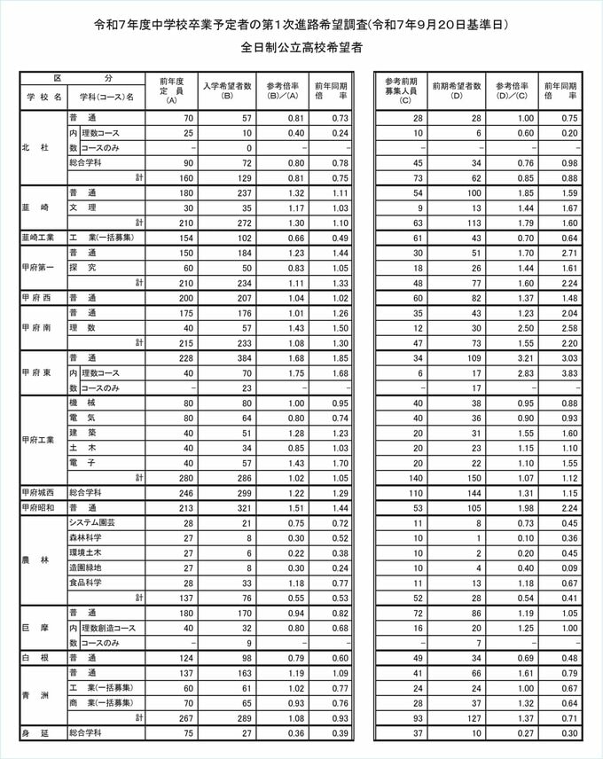 【全校掲載】中学3年生の第一次進路希望調査 全日制公立高校の参考倍率は2年連続で1倍を下回る 山梨