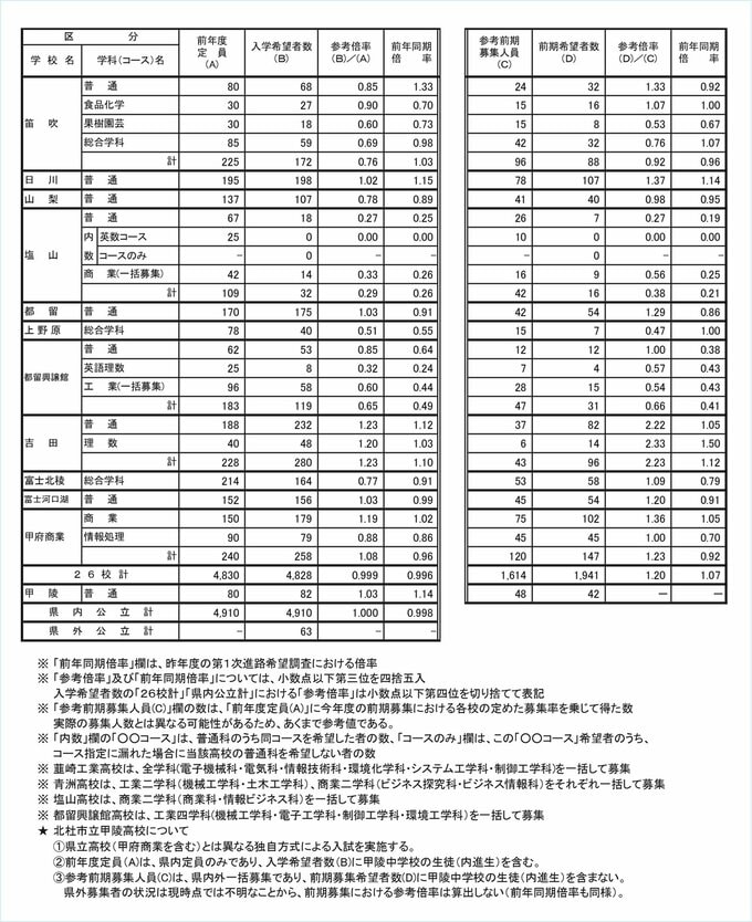 【全校掲載】中学3年生の第一次進路希望調査 全日制公立高校の参考倍率は2年連続で1倍を下回る 山梨