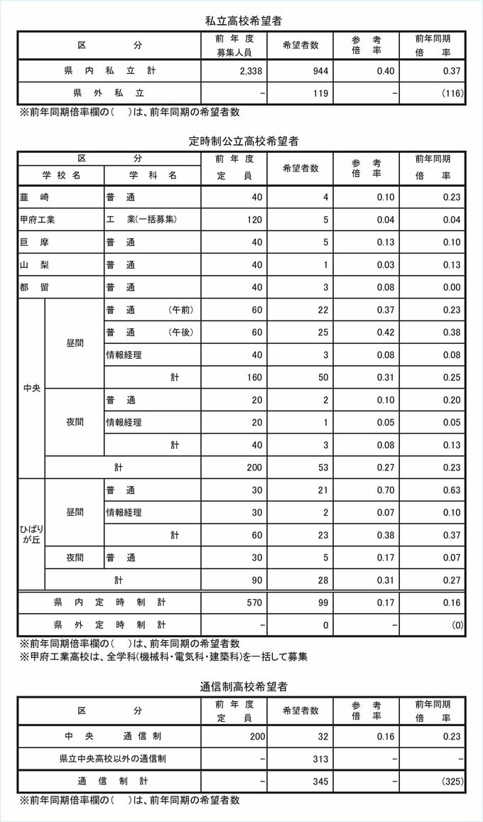【全校掲載】中学3年生の第一次進路希望調査 全日制公立高校の参考倍率は2年連続で1倍を下回る 山梨
