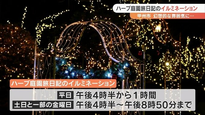 ハーブ庭園旅日記のイルミネーションは12月25日までで、平日は午後4時半から1時間。土日と一部の金曜日は午後8時50分まで点灯されます。