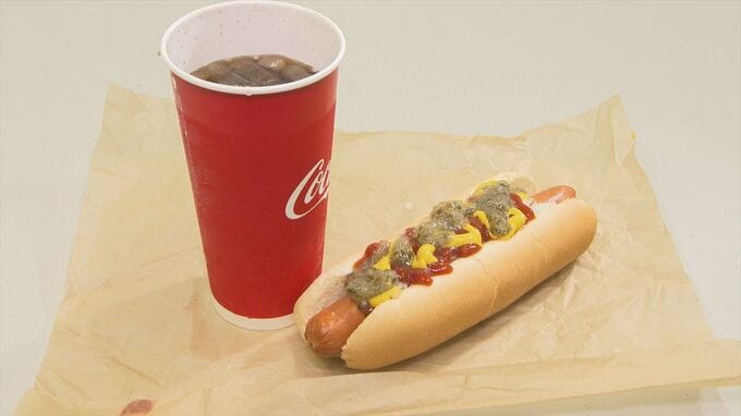 「最も人気のある商品は、ホットドッグ。こちらなんと値段が180円で、ホットドッグ+飲み放題のソーダも付いています」