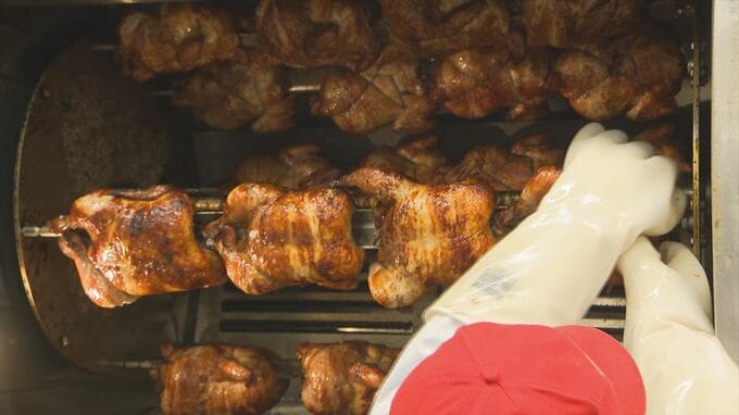店内にある大きなグリルで焼かれる丸鶏は1つの串につき4羽分並び、一度に最大32羽分焼くことが出来ます。