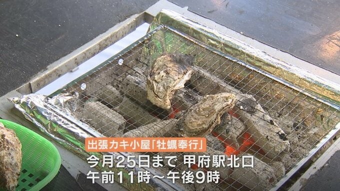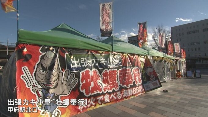 出張カキ小屋は12月25日まで、毎日午前11時から午後9時まで甲府駅北口で開催されています。