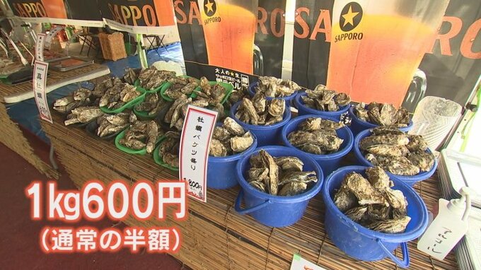 通常価格1kg1200円の大きな真牡蠣が半額で提供され、各テーブルで焼いて味わうことが出来ます。