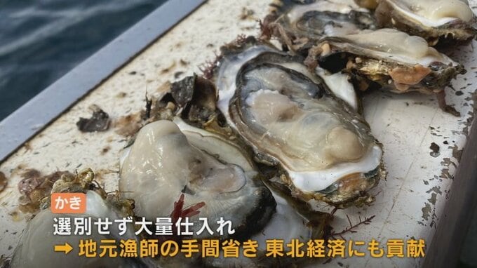 カキは選別せずに大量に仕入れることで地元漁師の手間を省くことができ、東北の経済にも貢献しています。