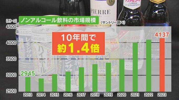 その一方、ノンアルコール飲料はというと同じ期間に市場規模が1.4倍に拡大しています。