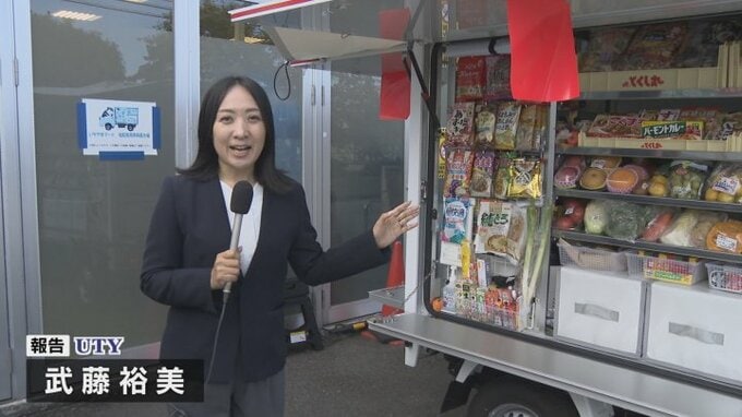 「こちらが移動スーパーのとくし丸。車体はコンパクトですが中を見ると果物に野菜、後ろに回ると生活用品に調味料とさまざまな商品がぎっしりつまっています」