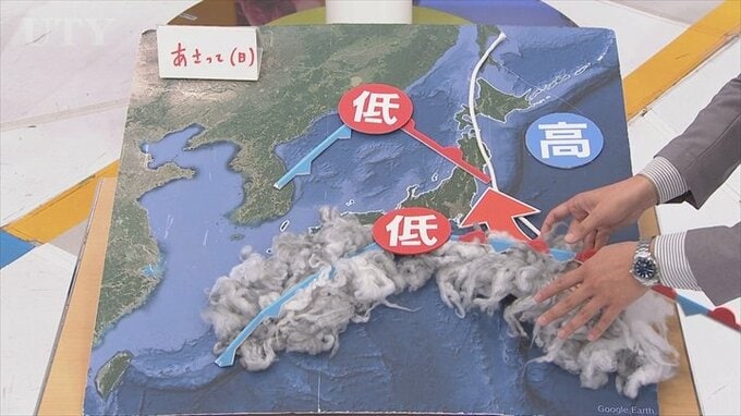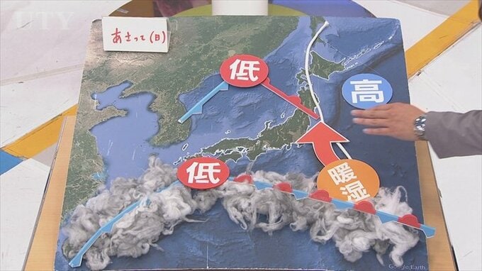 あさっては変わらず日本の東に高気圧がある状況で、雨雲のもととなる暖かく湿った空気が流れ込んできます。