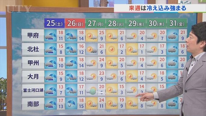 日中の最高気温はあまり変わらないんですが、朝の冷え込みが強まって北杜や河口湖など標高の高いところでは霜が降りるほどの冷え込みで、3℃以下となりますから、そろそろタイヤ交換の準備も考えてもらえたらと思います。