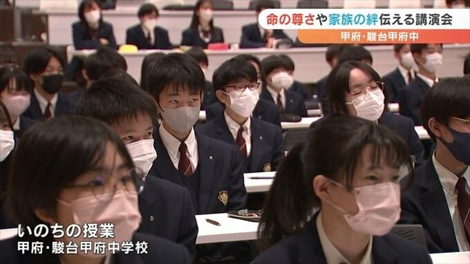 「いのちの授業」と題した講演会は、甲府市の駿台甲府中学校が開いたもので、2年生およそ180人が参加しました。