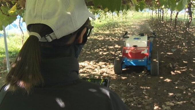 このなかでは遠隔操作できる草刈り機や農薬散布車が披露されたほか、超音波のセンサーで人の跡を自動でついてくる運搬車も公開されました