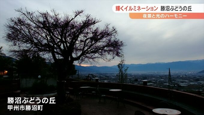南アルプスのシルエットと、甲府盆地の夜景、それにイルミネーションが光のハーモニーを奏でます。