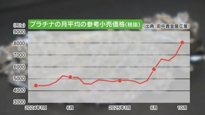 プラチナの小売価格は去年、月平均で1グラム当たりおよそ4400円から5200円で推移していたのが、先月は8021円と1.5倍以上。