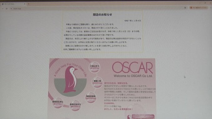 閉店するのはクリーニング店を展開するオスカーで、11月4日付けで会社のホームページで閉店のお知らせが掲載されました。