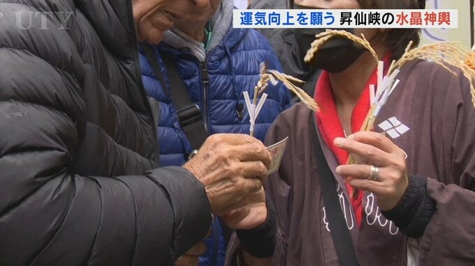 会場では縁起物として稲穂と水晶玉のお守りが配られ、訪れた人は金運や恋愛運といった運気向上を願っていました。