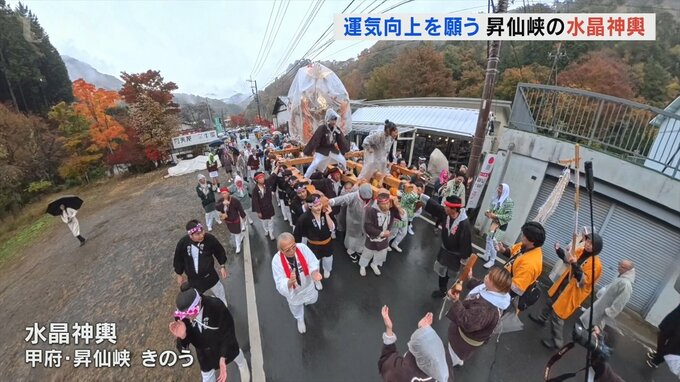 神輿には直径約60cm、重さ約100kgの巨大な水晶玉が祀られていて、9日は県の内外から訪れた観光客ら200人ほどが交代で神輿を担ぎ、紅葉が色づく昇仙峡周辺を2時間かけて練り歩きました。