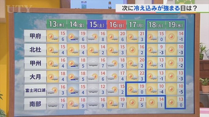 いつ頃フロントガラスが凍結する日が来るのかというと、月曜の夜から寒気が強まってきます。ですから火曜日水曜日の朝は氷点下のところも多くなってきます。甲府でも来週水曜日は-1℃を予想しています。