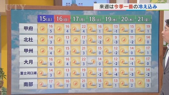 特にピークとなりそうなのが来週水曜日。甲府は最低気温-1℃、富士河口湖町は-4℃と水道管が凍結してもおかしくないぐらいの冷え込みとなりまして、それが木曜日にかけて続く見通しです。