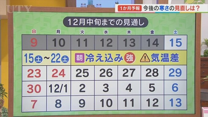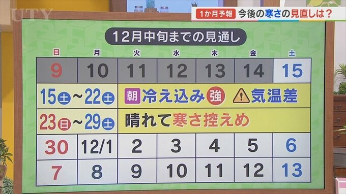 30日から12月の13日にかけては天気は晴れの日が多い見込みとなっています。ただ晴れると朝と昼の気温差が大きい状況となりますので、来週は冷え込みますけども、その先は冷え込みは少しは和らぐ見通しです。