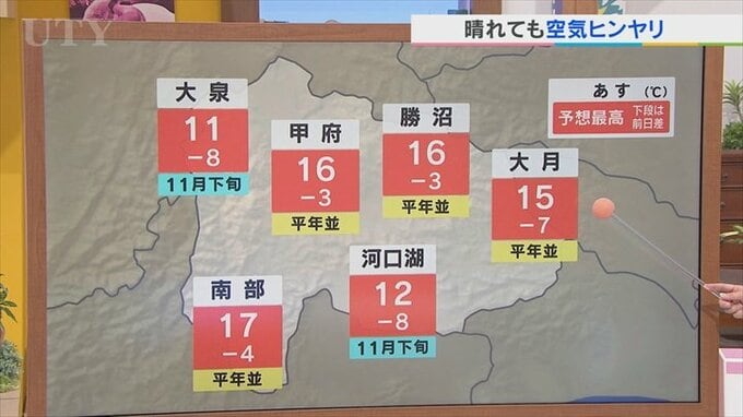 大月はきょうと比べて7℃も低い15℃予想。北杜市大泉や河口湖は8℃も低くなりまして11月下旬並みの気温です。