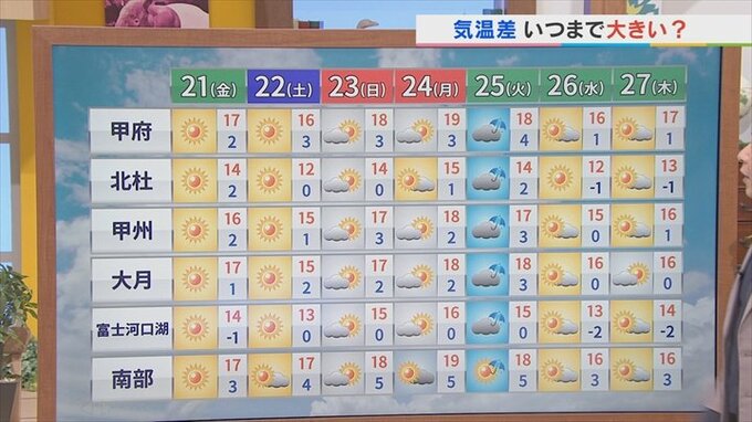 甲府で見ていきますとやはり気温差が大体15℃前後とあすと状況が変わらない形になりそうです。