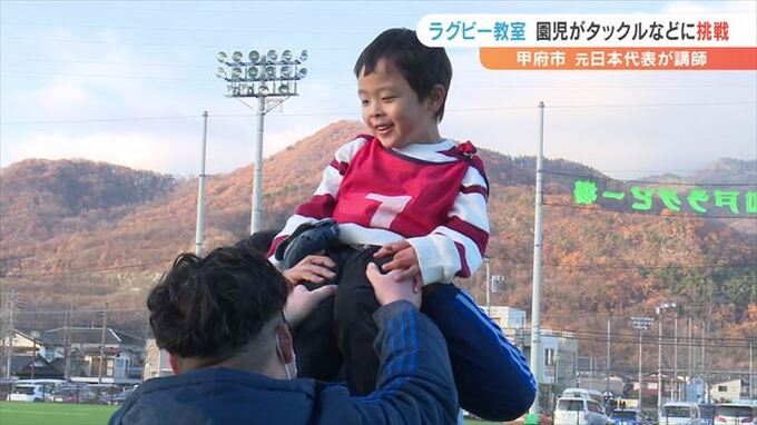 園児を対象としたラグビー教室が甲府市で開かれ、子どもたちがタックルなどに挑みました。
