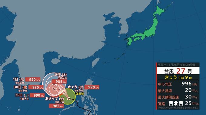 気象庁は台風27号(コト)の進路情報を26日午前9時45分に発表しました。