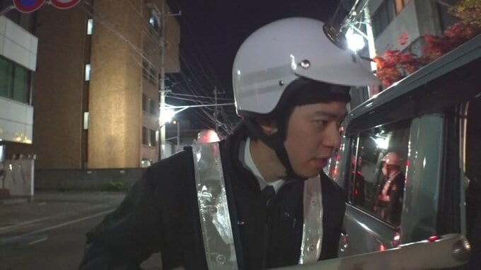 「すみません、甲府警察署です。飲酒の取り締まりしております。こちらのほうに息をふぅっと吹きかけていただいてよろしいですか?」