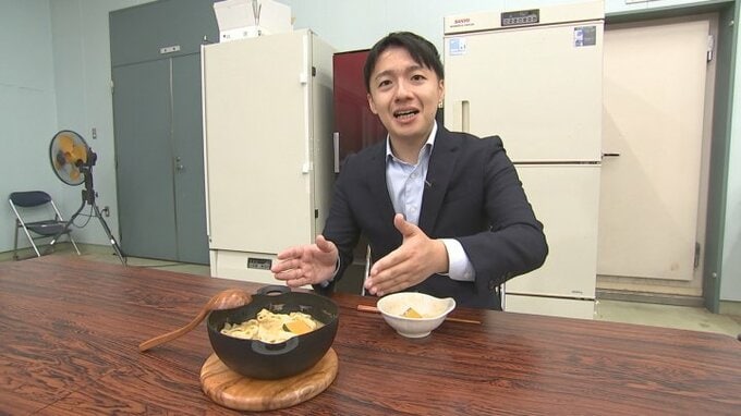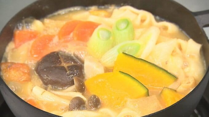 「まろやかな甘めの味噌スープにやわらかくなったほうとう麵がよく合いますね。実は、このほうとうの美味しさは この鍋に秘密があるんです」