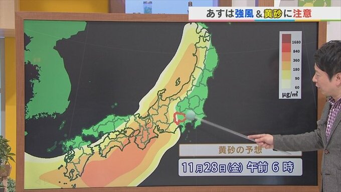 いつぐらいにこの黄砂が飛んでくるかといいますと、あすの午前6時の段階では中西部の山沿いにかかってくるような状況です。