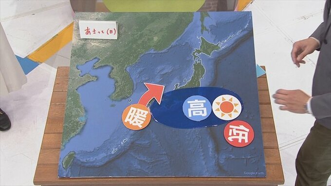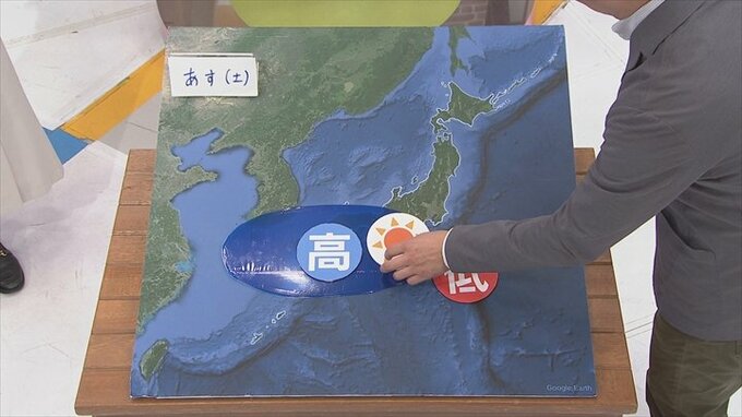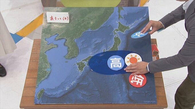 一方、あさって日曜日になりますと、この高気圧が今度は東へ進んでいきます。