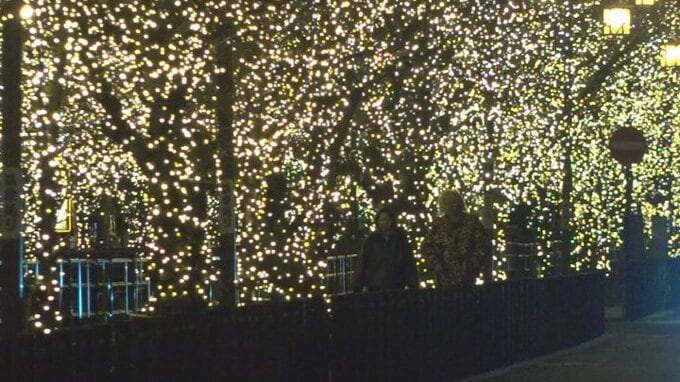 シャンパンゴールドとオフホワイトの2色のライトに彩られた遊歩道にはモニュメントも設置され、観光客が冬の夜を楽しんでいました。