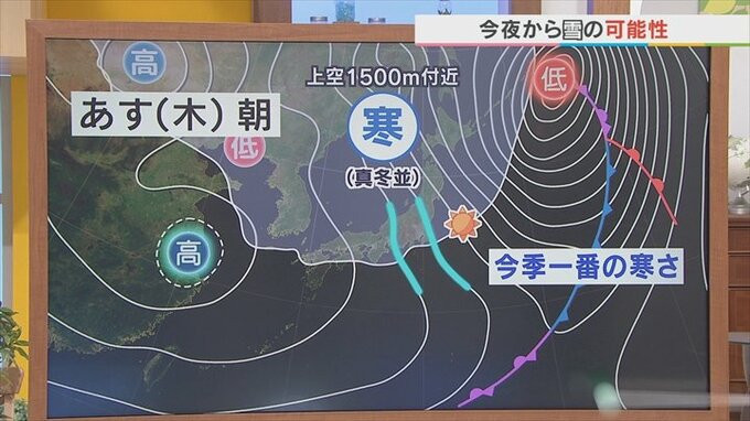 4日は晴れても今季一番の寒さ 今夜から雪が降るところもありそう 米津龍一気象予報士が解説 山梨 2025年12月3日(水) 19:40 国内 天気 あすになりますとこの等圧線の間隔がだんだん広がってきますので風は今よりも弱まる見通しです。 ただ、上空の冷たい空気=寒気がきょうよりも強まる予想となっていますので、今季一番の寒さとなりそうです。